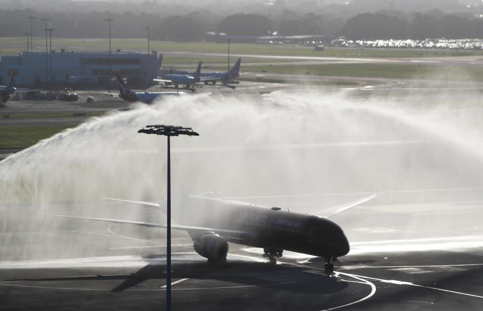 12月17日,澳大利亚悉尼机场以“水门仪式”迎接吉祥航空上海-悉尼洲际航线首航航班。新华社记者 马平 摄