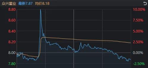 近期走趋势上涨的众兴菌业,10:15开始爆拉触及20cm涨停,10:20封板失败便急速回落,午后持续震荡回落,收跌1.62%。