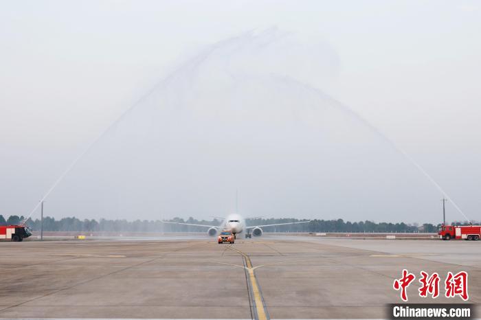 HB850航班在三峡国际机场接受“水门礼”。董晓斌 摄