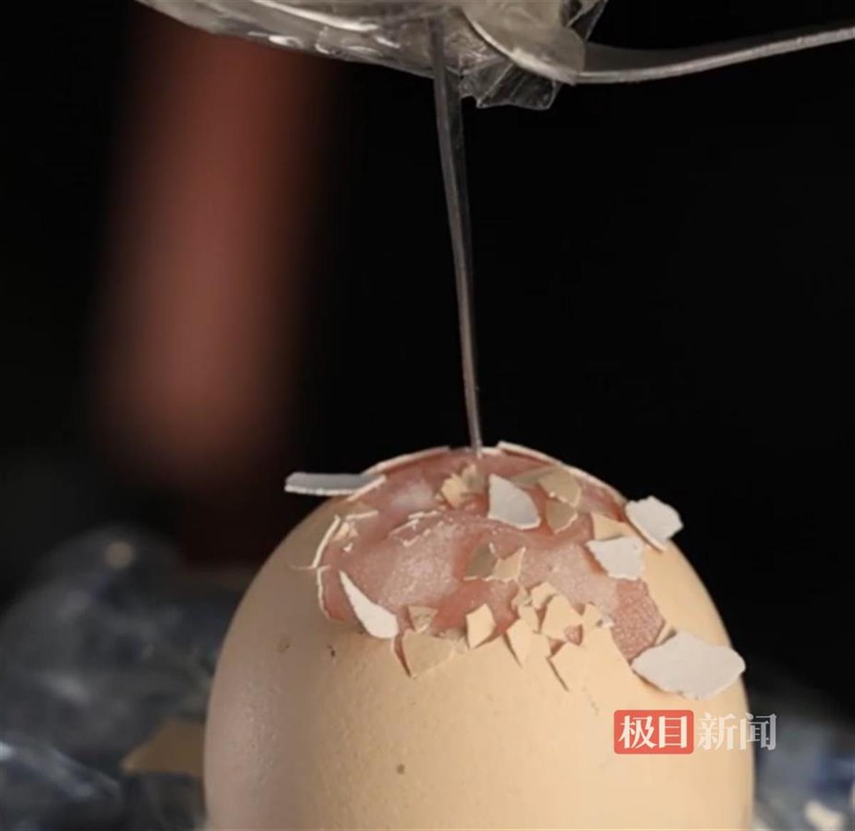 只见他指令机器人用一只“手”,握住一把普通的镊子,镊子的尖头,只有1毫米,下方,是一枚刚买来的生鸡蛋。他屏住呼吸,全神贯注,轻轻戳破2毫米的鸡蛋外壳,然后左挑右拨,慢慢扩大至2平方厘米,露出完好无损的一层薄薄的鸡蛋膜,前后用时6分钟。