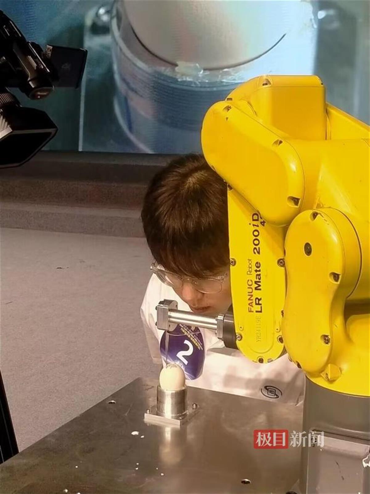 用机器人剥生鸡蛋壳,0.02毫米的鸡蛋膜不破。当着记者的面,年轻而又自信的余乐做得从容不迫,展示了精妙的机器人操作技术。