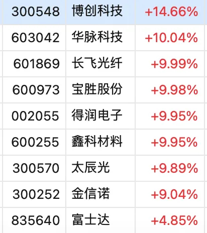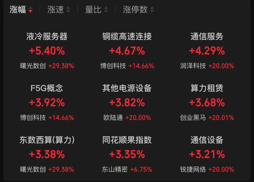 从板块来看,通信设备、算力概念股集体爆发。液冷服务器、铜缆高速链接、通信服务、其他电源设备、F5G概念、算力租赁、东数西算(算力)、通信设备等板块涨幅靠前。