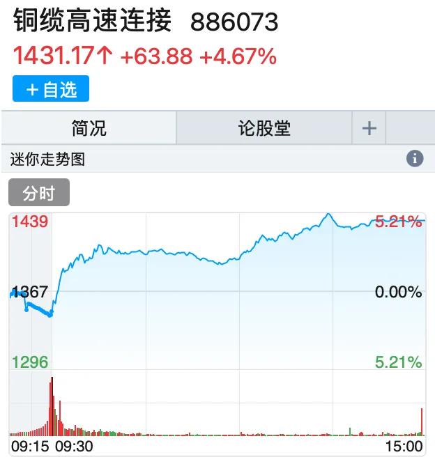 铜缆高速连接概念也放量走强,板块指数盘中大涨逾4%,创1个多月来新高,并逼近历史最高点。