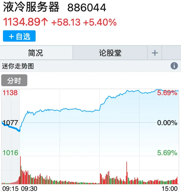 通信设备概念股全线走强,液冷服务器方向领涨,板块指数低空之后直线拉升,仅约10分钟就由跌逾1%转为涨逾2%,截至收盘涨5.4%。