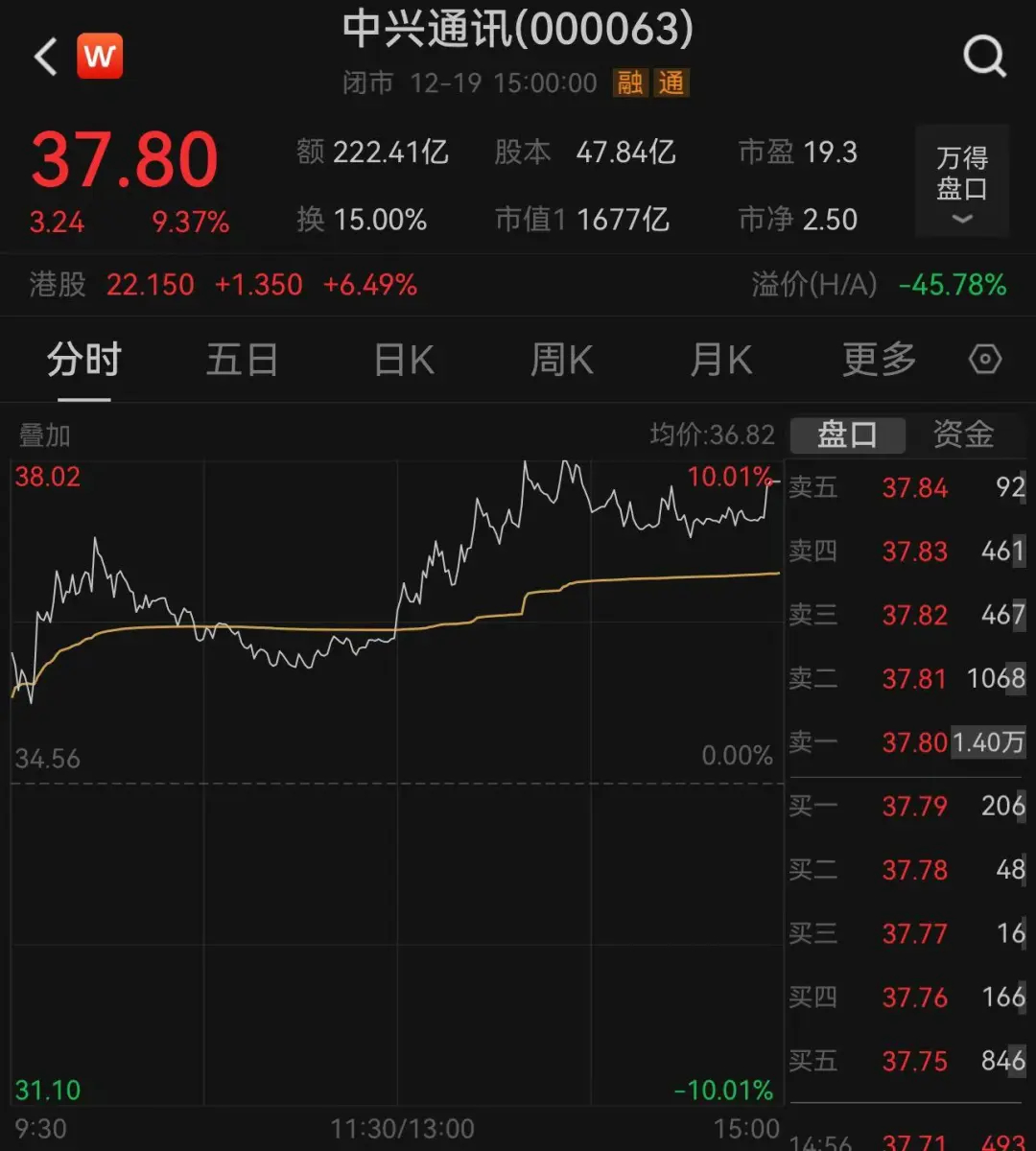 另外,12月19日,A股硬科技的代表公司中兴通讯(000063)盘中触及涨停板,股价创近一年来新高,A股市值重回1500亿元以上。截至收盘,中兴通讯成交额达222.41亿元,打破该股单日历史成交纪录,并再次夺得A股成交冠军宝座。