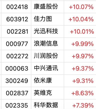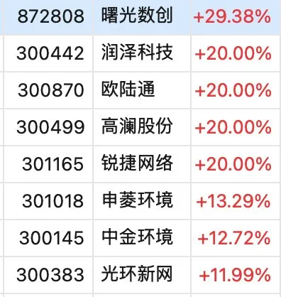 个股中,曙光数创上涨29.38%、欧陆通、润泽科技、高澜股份、锐捷网络盘中均直线20%涨停,康盛股份、佳力图、光迅科技等亦垂直封板。