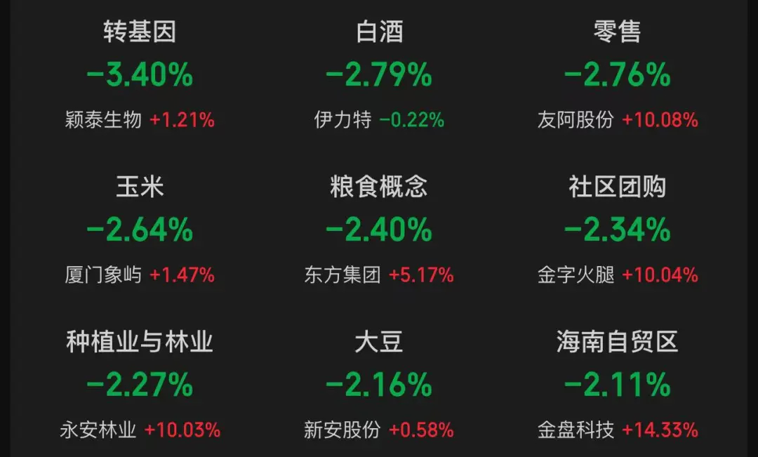 转基因、白酒、零售、零售、玉米、社区团购、粮食概念、种植业与林业、大豆、海南自贸区等板块跌幅靠前。