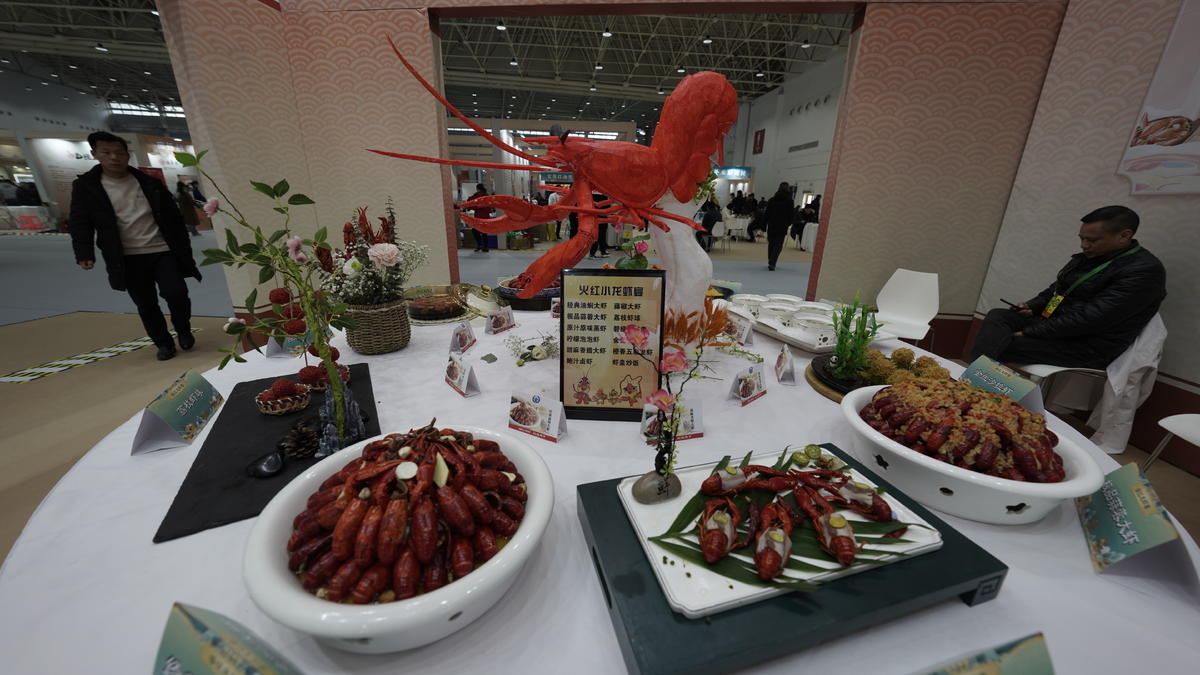 其中,“火红小龙虾宴”是由极品油焖大虾、藤椒大虾、极品蒜蓉大虾、柠檬泡泡虾、金丝沙拉虾、橙香五彩龙虾、鲍汁卤虾等12种不同烹饪方法的小龙虾菜品组成;“盘笼宴”则气势更加盛大,一共有20多种菜品。而且这些菜品在圆桌上的摆放颇为讲究,给现场逛展的市民端出了一桌饕餮盛宴。