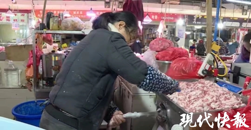 店主杨雪说:“最近生意非常火爆,冬至前一星期和后一星期是一年当中生意最好的,这个时候适合灌香肠。猪肉价格比之前下调了一点,新鲜的肉15块钱一斤,冷鲜肉13块钱一斤,排骨也便宜,加工费两块钱一斤。”