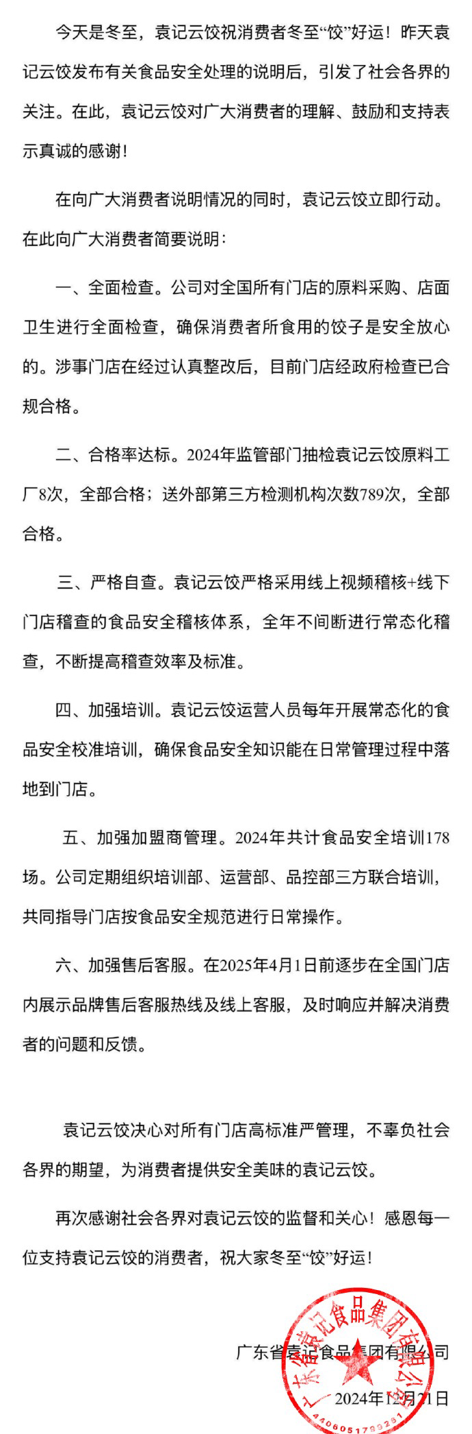 12月21日晚,@袁记云饺官方微博 发布最新情况说明称,涉事门店在经过认真整改后,目前门店经政府检查已合规合格。同时表示,在2025年4月1日前逐步在全国门店内展示品牌售后客服热线及线上客服,及时响应并解决消费者的问题和反馈。