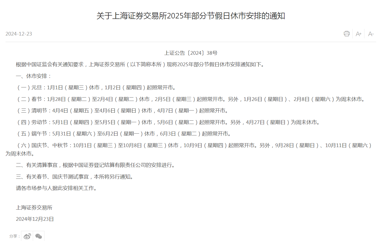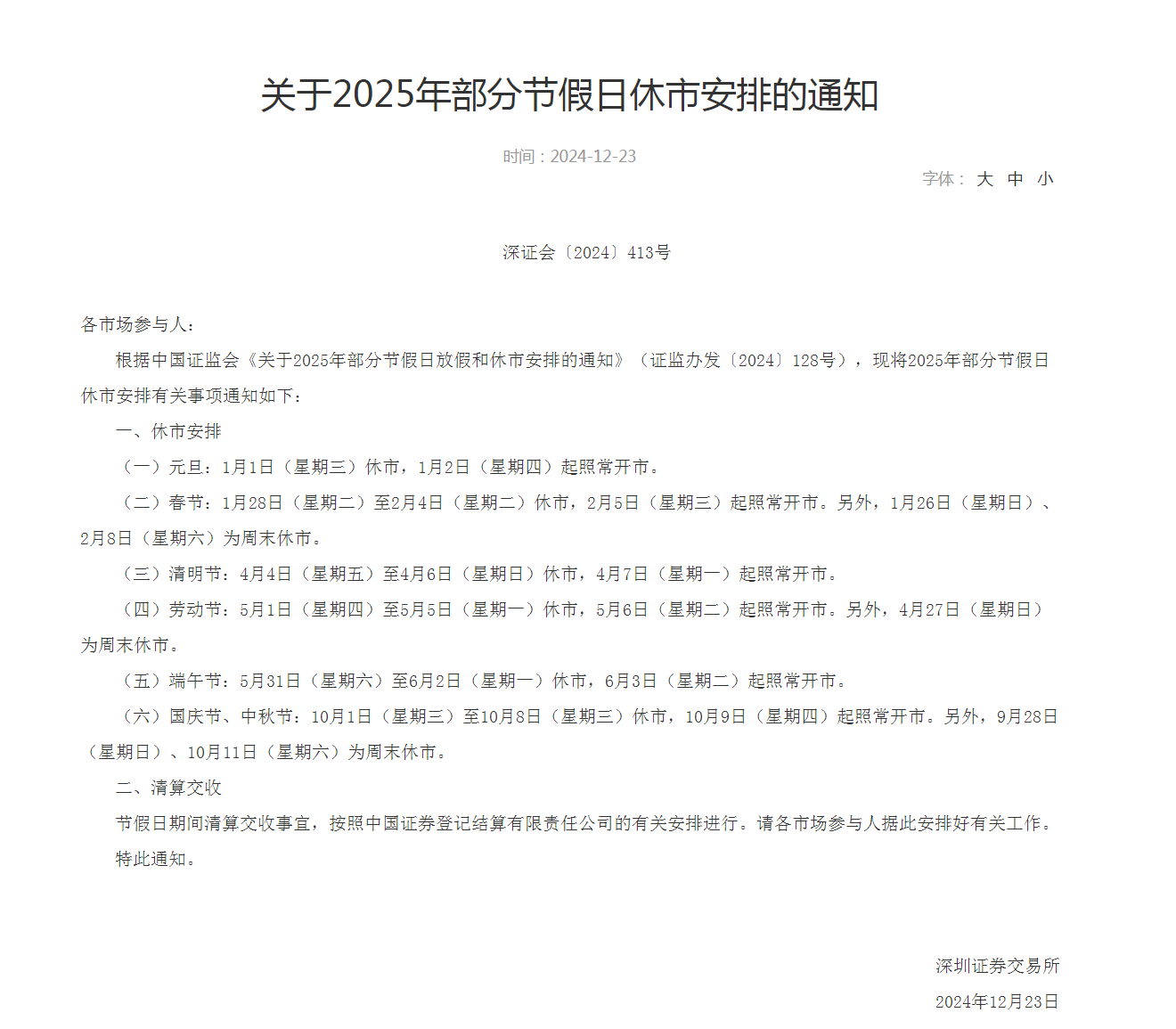12月23日,上海证券交易所、深圳证券交易所公布2025年部分节假日休市安排: