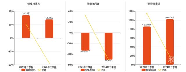 据奥康国际发布的三季度业绩公告,2024年前三季度营收约18.88亿元,同比减少18.8%;归属于上市公司股东的净利润亏损约1.36亿元;基本每股收益亏损0.3391元。