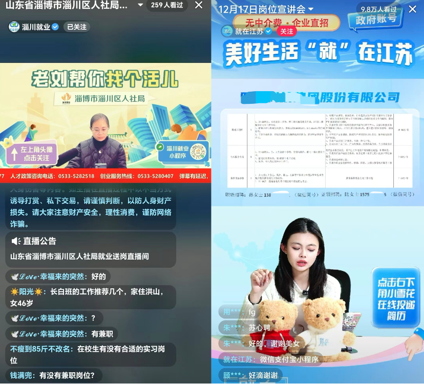 直播带岗还获得了各地政府部门的支持,为各地稳就业提供了助力。