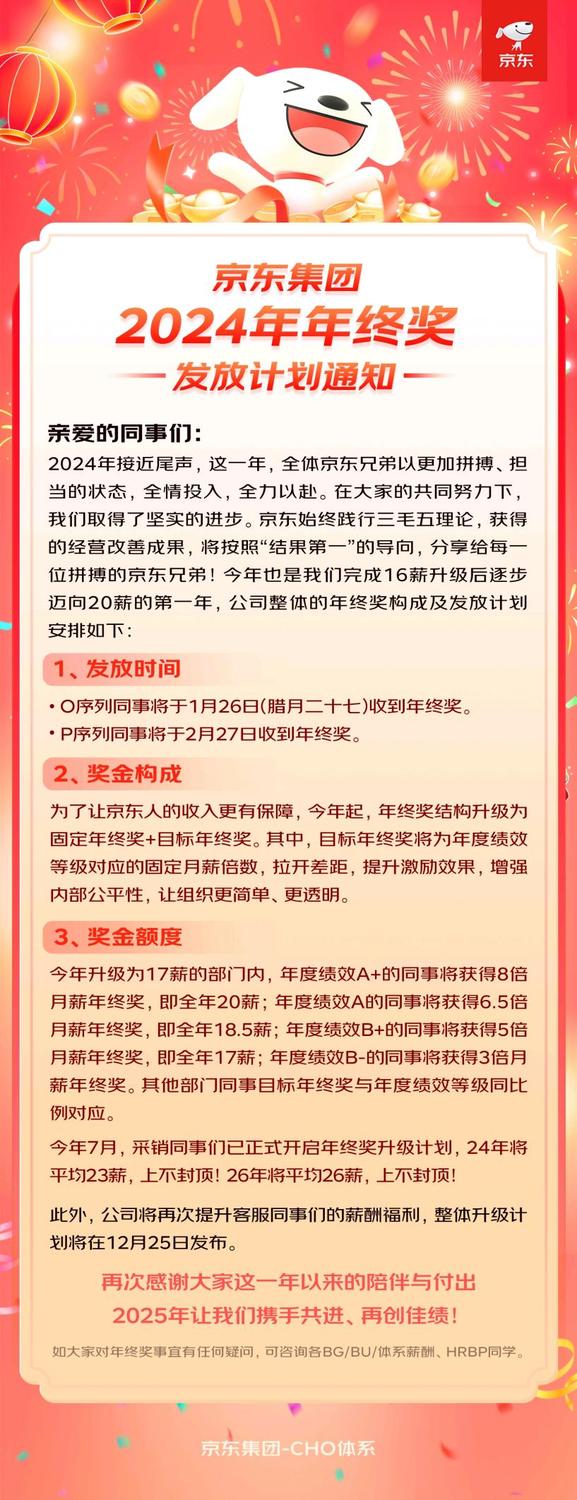 12月23日,京东发布了2024年年终奖发放计划通知(以下简称通知)。根据通知,实现17薪的部门内,年度绩效A+的员工将实现20薪,京东采销2024年的平均薪资将达到23薪。