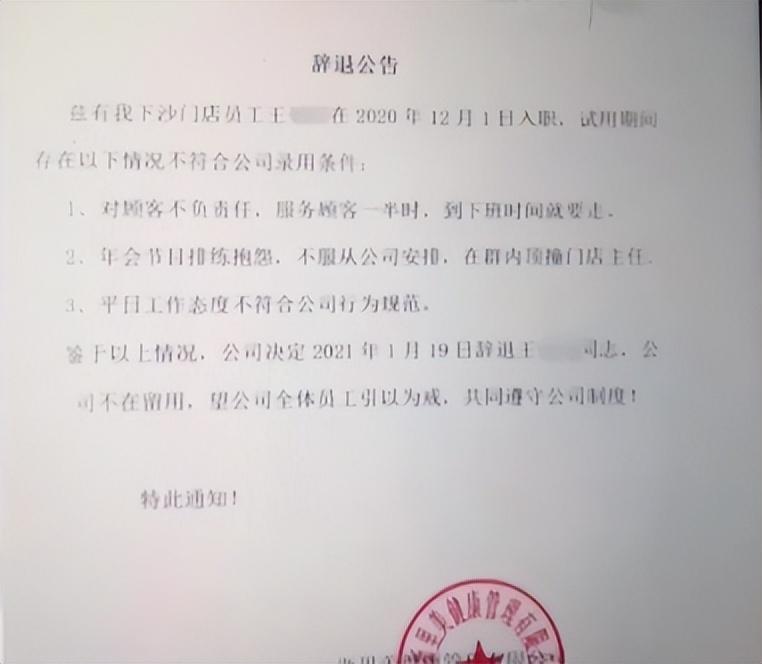 没想到,公司在她辞职后,发布了一条出人意料的辞退公告,上面列明了3条辞退理由: