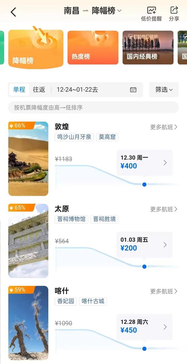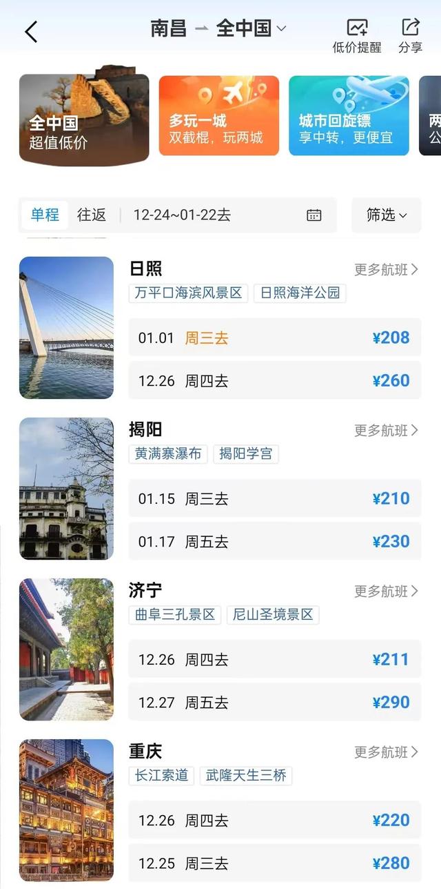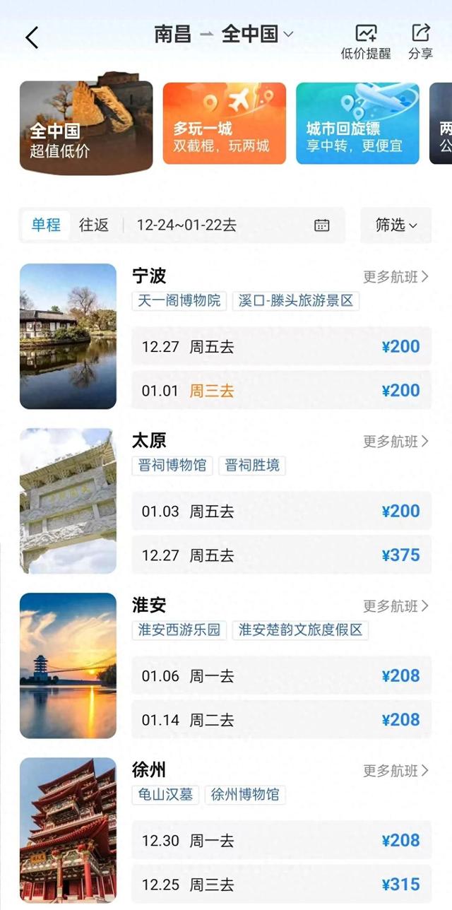 青岛、武汉、西安等部分城市出发的机票价格相对较低,返乡航线的机票价格也降至4—6折之间。