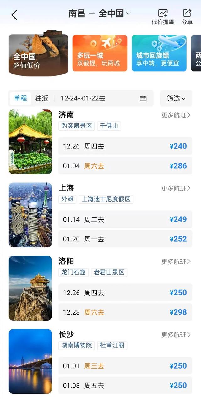 飞往重庆、哈尔滨、贵阳等兼具旅游和返乡客流的航线,有7—9折的机票在售;