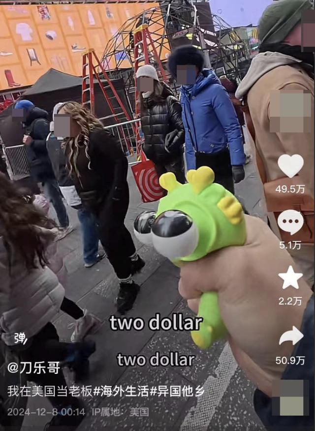 近期,一位网名为“刀乐哥”的博主在抖音平台走红。视频中“刀乐哥”凭借有限的词汇行走在美国街头,只用一句“two dollar”便向美国消费者兜售起爆眼龙捏捏乐小玩具等商品。