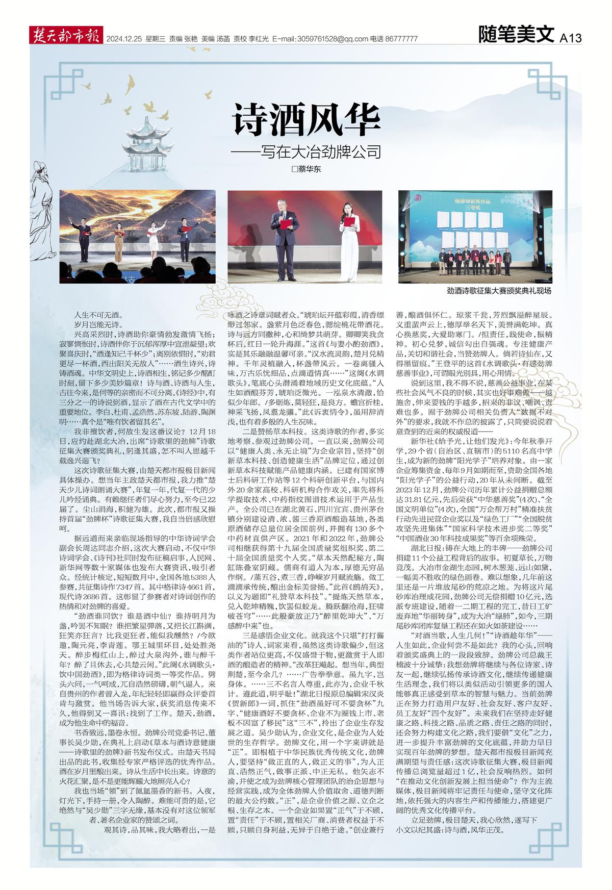 “对酒当歌,人生几何!”“诗酒趁年华”——人生如此,企业何尝不是如此?我的心头,回响着颁奖盛典上的一段段致辞。劲牌公司总裁王楠波十分诚挚:我想劲牌将继续与各位诗家、诗友一起,继续弘扬传承诗酒文化,继续传递健康生活理念,我们将以类似活动引领更多的国人能够真正感受到草本的智慧与魅力。当前劲牌正在努力打造用户友好、社会友好、客户友好、员工友好“四个友好”。未来我们在坚持走好健康之路、科技之路、品质之路、责任之路的同时,还会努力构建文化之路,我们要借“文化”之力,进一步提升丰富劲牌的文化底蕴,并助力早日实现百年劲牌的梦想。楚天都市报极目新闻充满期望与责任感:这次诗歌征集大赛,极目新闻传播总浏览量超过1亿,社会反响热烈。如何“在推动文化创新发展上担当使命”?作为主流媒体,极目新闻将牢记责任与使命,坚守文化阵地,依托强大的内容生产和传播能力,搭建更广阔的优秀文化传播平台。