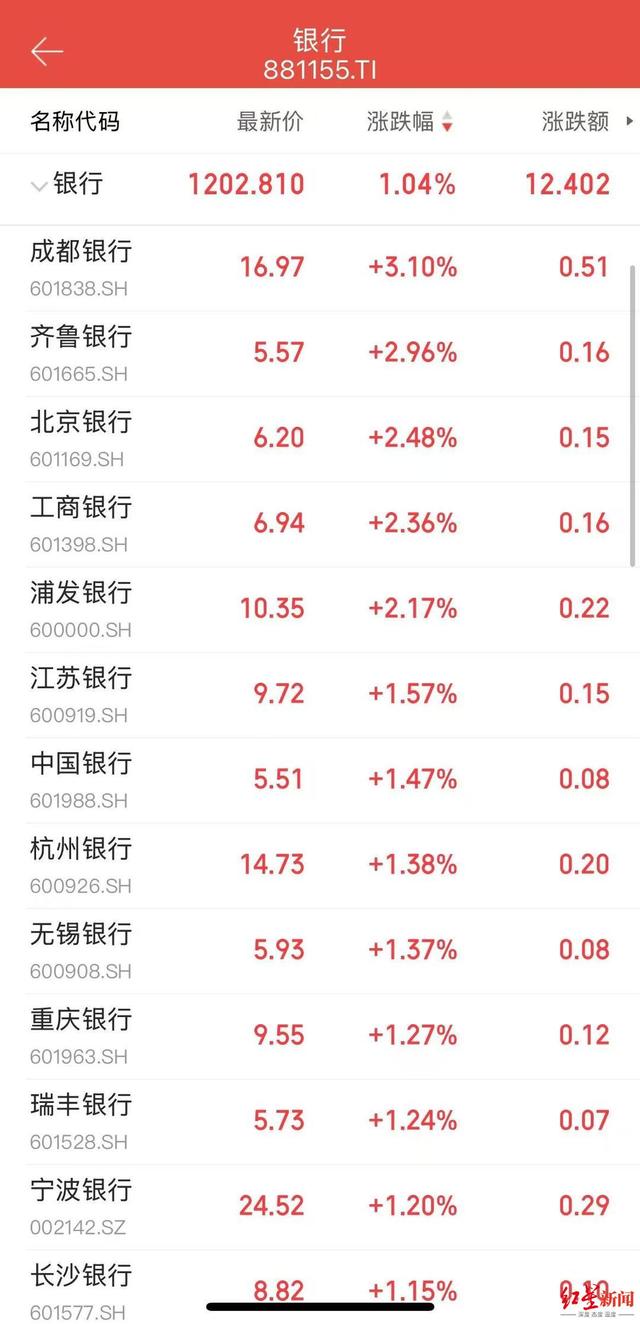 除了四大行表现亮眼,今日中小银行亦录得较大涨幅。截至收盘,成都银行、齐鲁银行、北京银行、浦发银行均涨超2%。江苏银行、杭州银行、无锡银行、重庆银行、宁波银行、长沙银行等十余股均涨超1%。
