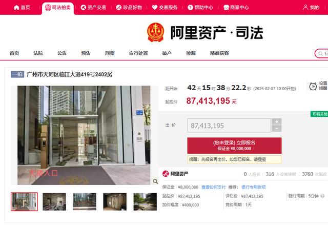 据阿里资产拍卖网挂网信息,位于广州市天河区临江大道419号2402房将于2025年2月7日10:00开拍,起拍价和评估价均为8741.3195万元。该套豪宅的现有主人,正是韩后集团创始人王国安。