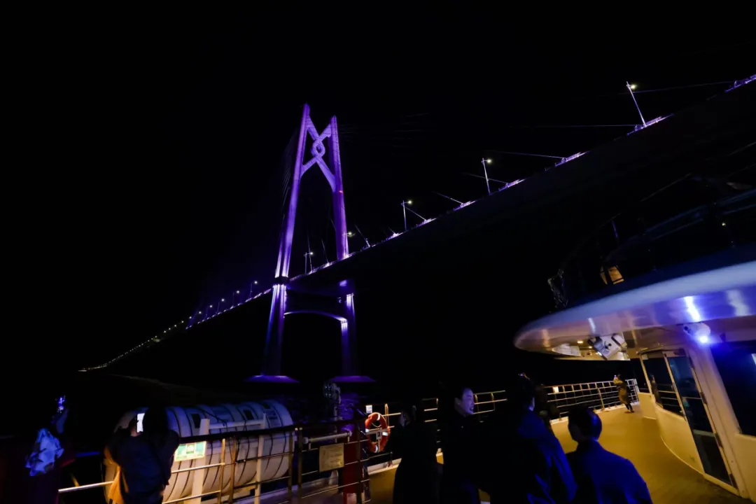 在晚上七点半左右,游轮缓缓驶向港珠澳大桥,从青州航道桥下驶过,穿桥而过,大家挥舞国旗来到游轮二楼甲板上,记录这一激动人心的瞬间。青州航道桥是港珠澳大桥最具特色的部分,巨型索塔矗立于海上,塔上端的造型是象征港珠澳三地紧密相连的“中国结”。