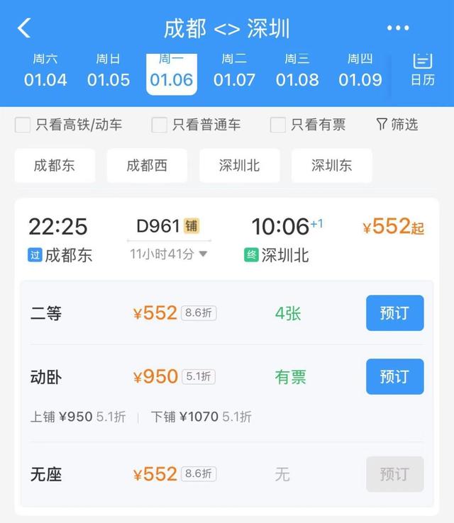 在票价方面,D961次动卧列车分为二等座、动卧和无座票,其中,成都至深圳的二等座和无座票售价均为552元,动卧票价上铺为950元,下铺为1070元。