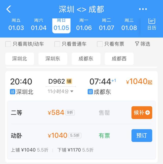 从大湾区开往成都的D963次列车分为二等座和动卧票,其中深圳至成都的二等座票价为584元,动卧上铺1040元,下铺1170元。