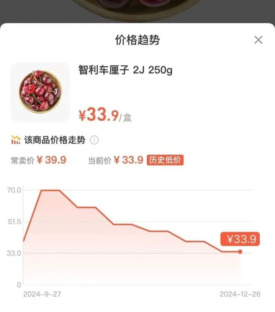 在线上平台,车厘子也同样受欢迎。记者通过 “盒马” APP 搜索发现,车厘子霸榜水果礼盒热卖榜Top3,部分车厘子的价格还标记为历史低价,这款2J 250g的智利车厘子,价格走势呈现直线下降的趋势,现在的售价已经降到了11月的一半。