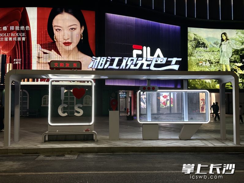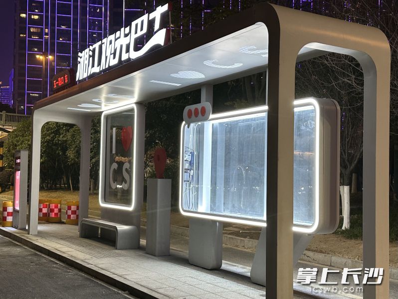 红白相间的简约配色、新颖时尚的打卡图标、明亮的白炽灯,共同构成了湘江观光巴士的候车亭。走进湘江观光巴士文和友东站,记者看到候车亭左侧写有“我爱长沙”的英文字样,已经有市民在此处休憩。