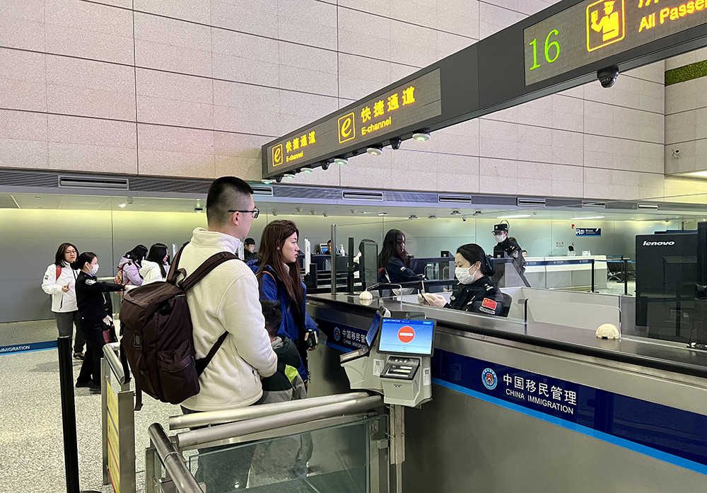 清晨6时30分,搭乘MU721(上海虹桥—香港)航班旅客和机组人员陆续到达边检查验大厅。在边检工作人员的引导下有序排队候检。验证台内,移民管理警察认真查验旅客信息,快速为他们办理边检通关手续。