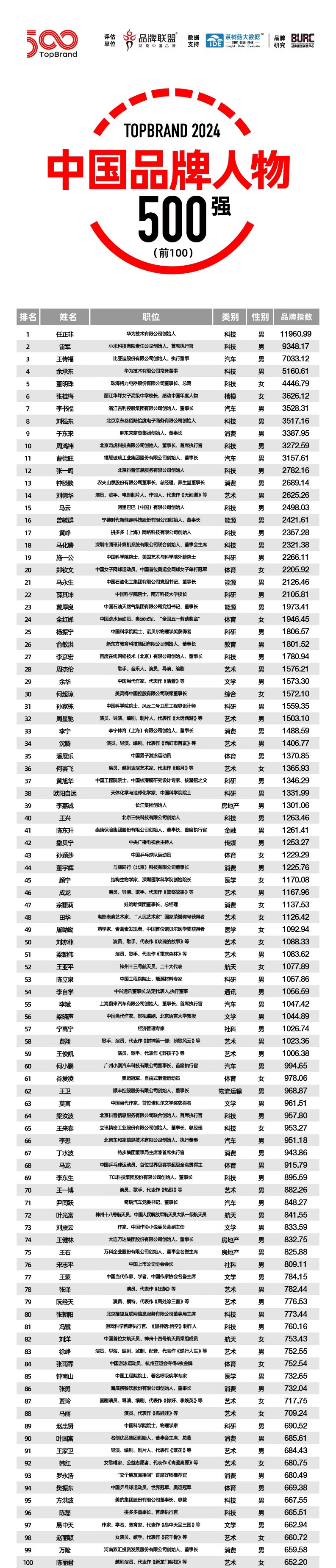 该份榜单显示,任正非、雷军、王传福被评为《TopBrand2024中国品牌人物500强》前三甲。余承东、董明珠、张桂梅、李书福、刘强东、于东来、周鸿祎分居4-10名。