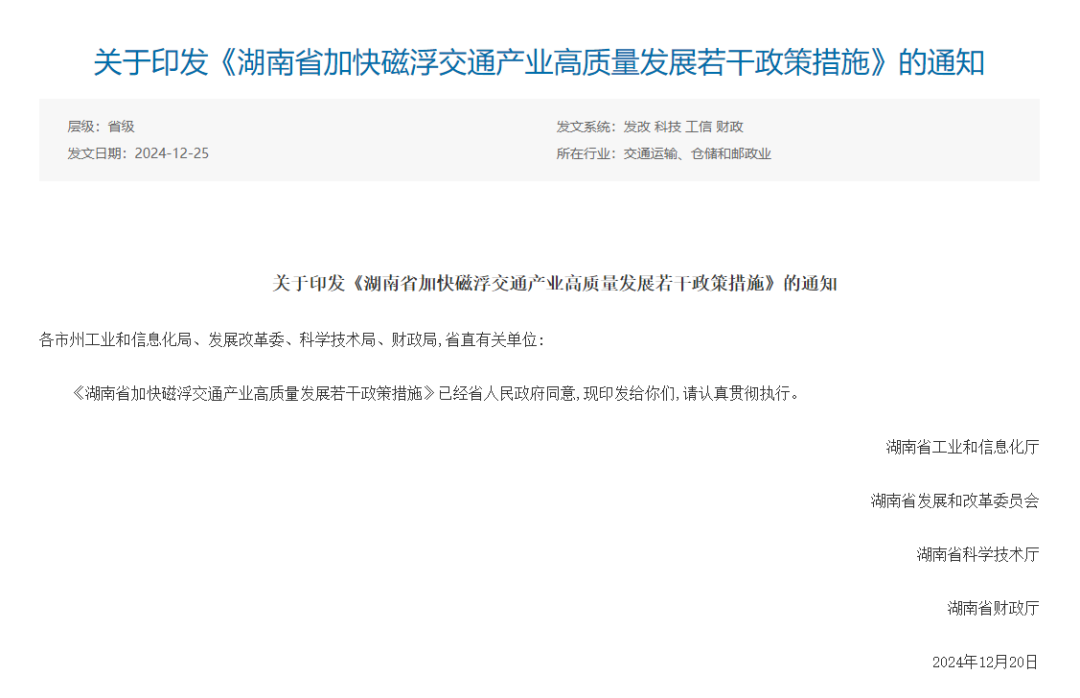 近日,湖南省工业和信息化厅、湖南省发展和改革委员会、湖南省科学技术厅、湖南省财政厅联合印发《湖南省加快磁浮交通产业高质量发展若干政策措施》。未来三年,湖南将倾斜优质要素资源,推动磁浮交通产业在技术创新、企业发展、产业生态等方面取得显著成效。