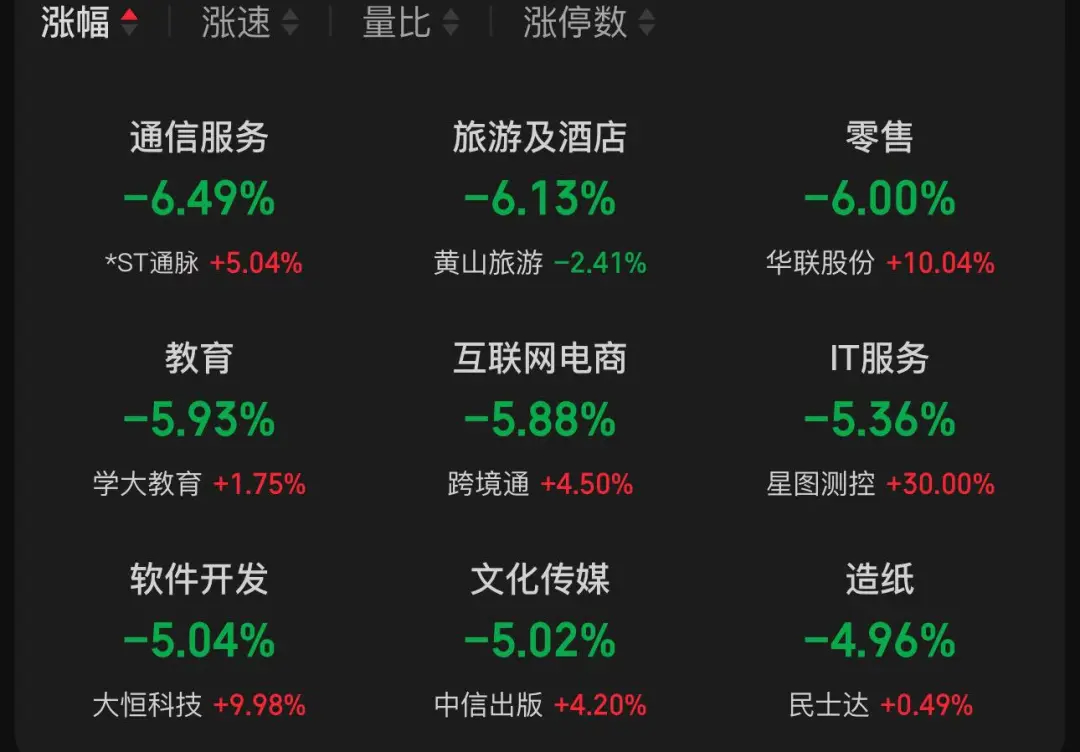 下跌方面,微信小店等消费股集体调整,来伊份等多股跌停。通信服务、旅游及酒店、零售、教育、互联网电商、IT服务、软件开发、文化传媒、造纸跌幅靠前。
