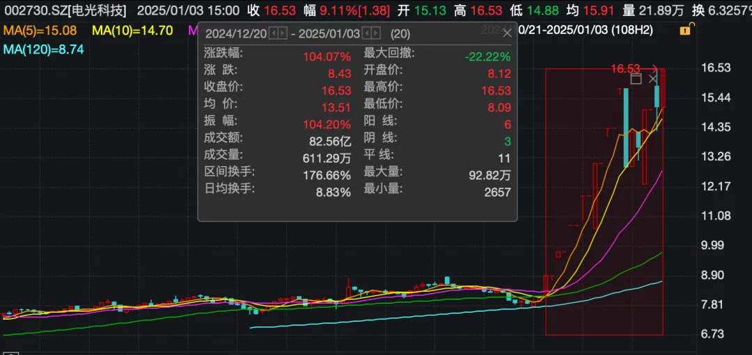 电光科技此轮上涨始于12月19日,当日股价上扬2.53%,报收8.1元/股。2024年12月20日—2025年1月3日这10个交易日内,电光科技累计斩获8个涨停板,区间累计涨幅104.07%。