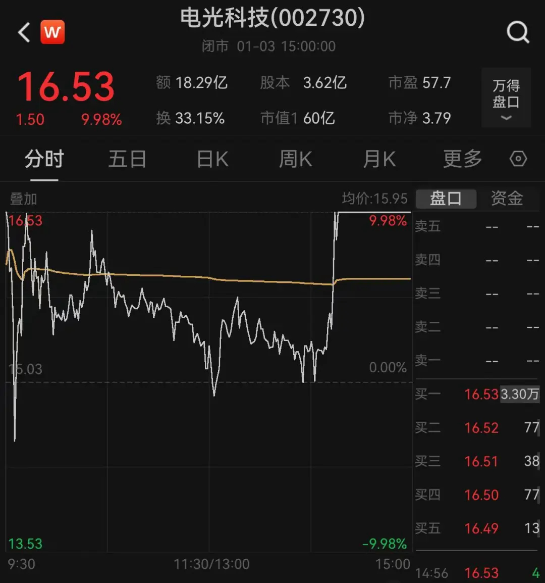 个股方面,14:15,电光科技(002730)突然发力,直线涨停,股价报16.53元/股,最新市值为60亿元。