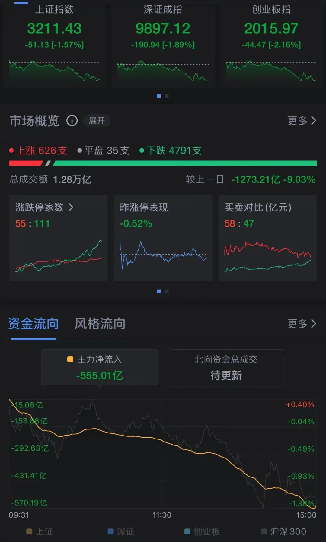 盘面上,热点匮乏,个股普跌,全市下跌个股4791只,跌停111只,上涨个股626只,涨停55只。全市场成交额1.28万亿元,较昨日缩量1273.21亿元。值得一提的是,这是沪深两市成交额连续第67个交易日突破1万亿。