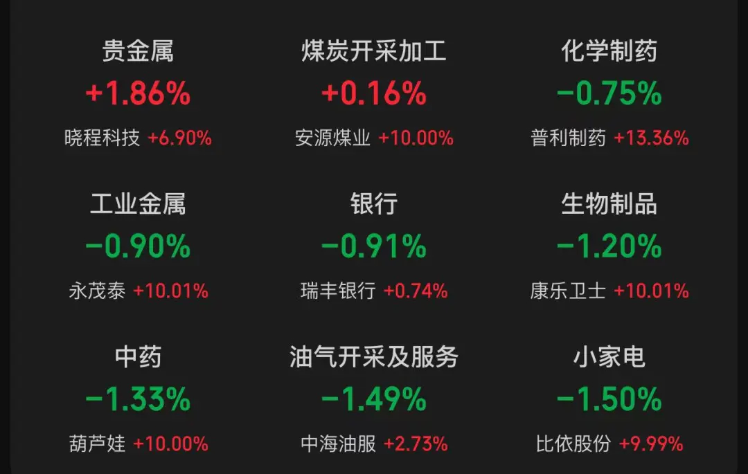从板块来看,AI眼镜概念股一度冲高,国星光电等涨停。流感概念股局部活跃,鲁抗医药涨停。截至收盘时,贵金属、煤炭开采加工两大板块涨幅靠前。
