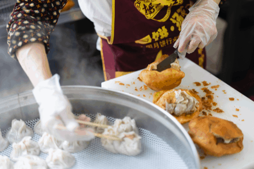 油饼包烧麦,外皮酥脆、内馅鲜美的烧麦被包裹在香软的油饼之中,一口咬下,过瘾!