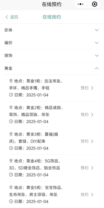 顾客可于每日上午9点登录微信小程序预约,系统将自动分配预约号码(周二闭店)。黄金各柜台每日首批发放50个预约号,接待完首批顾客后,将根据现场情况不定时放号,以满足更多顾客的需求,具体细则如下: