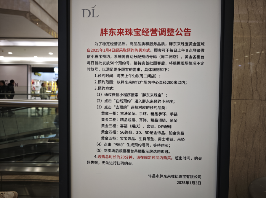 胖东来珠宝黄金区域自2025年1月4日起采取预约购买方式。每日上午9点首批发放50个预约号,接待完首批顾客后,将根据现场情况不定时放号。