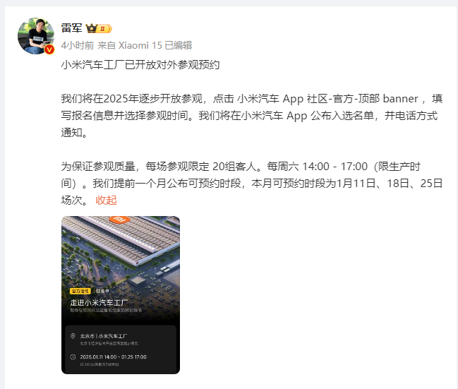 1月4日11时,雷军发文称:小米汽车工厂全面开放对外参观预约。
