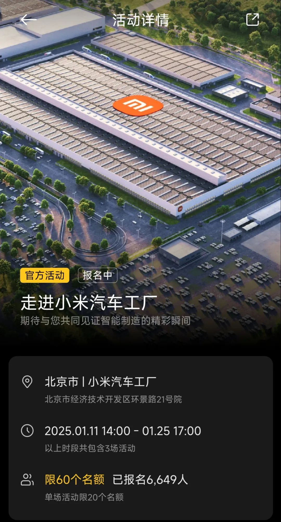 “我们将在2025年逐步开放参观,点击小米汽车App社区-官方-顶部banner ,填写报名信息并选择参观时间。我们将在小米汽车App公布入选名单,并电话方式通知。”