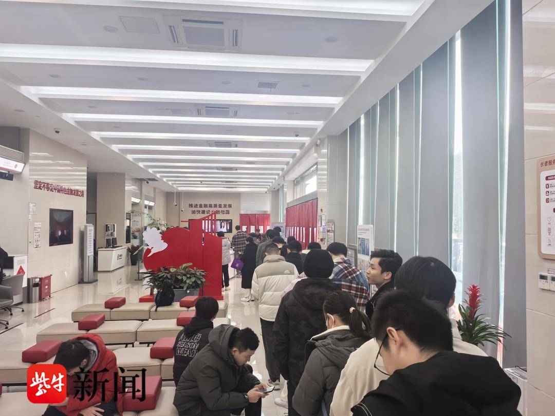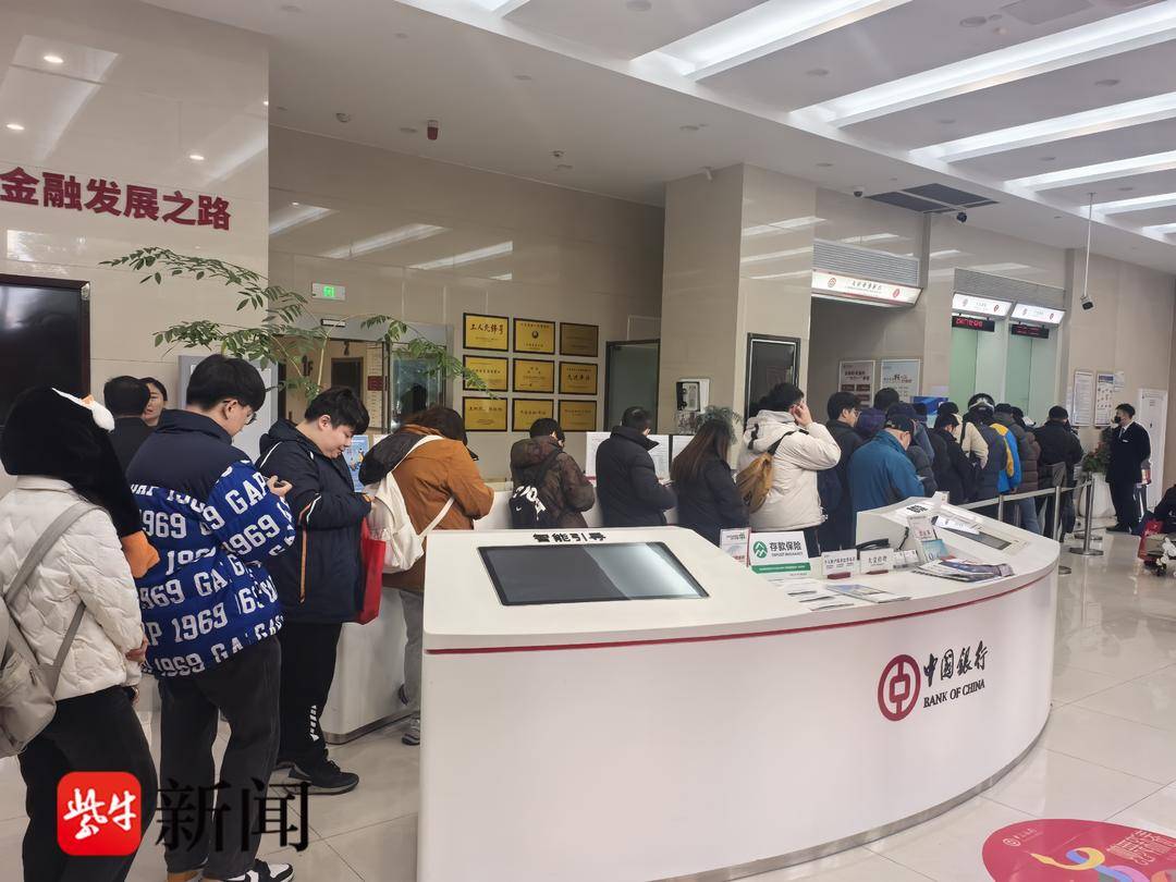 1月3日上午9点,南京市秦淮区大光路某银行网点,已有40多位市民在大厅等待兑换。为了加快进度,该网点贴心开设了兑换绿色窗口,门口有一个智能机器人不断在提醒市民携带身份证原件和现金。