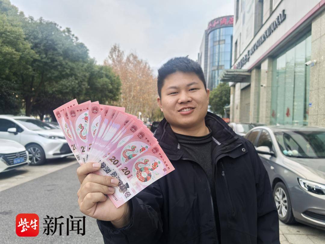 在等待一个小时后,南京市民马先生成功兑换到了20枚蛇年纪念币。48岁的马先生正逢本命年,是个纪念币收藏新手。“我很早就关注到了蛇币蛇钞,让女儿帮忙一起抢,最后只抢到了一套20枚纪念币。但是我一直刷新、换网点,最后在另一个网点抢到一套20张纪念钞,也算是新年的好彩头。”聊完,马先生激动地说准备去另一个网点兑换纪念钞。