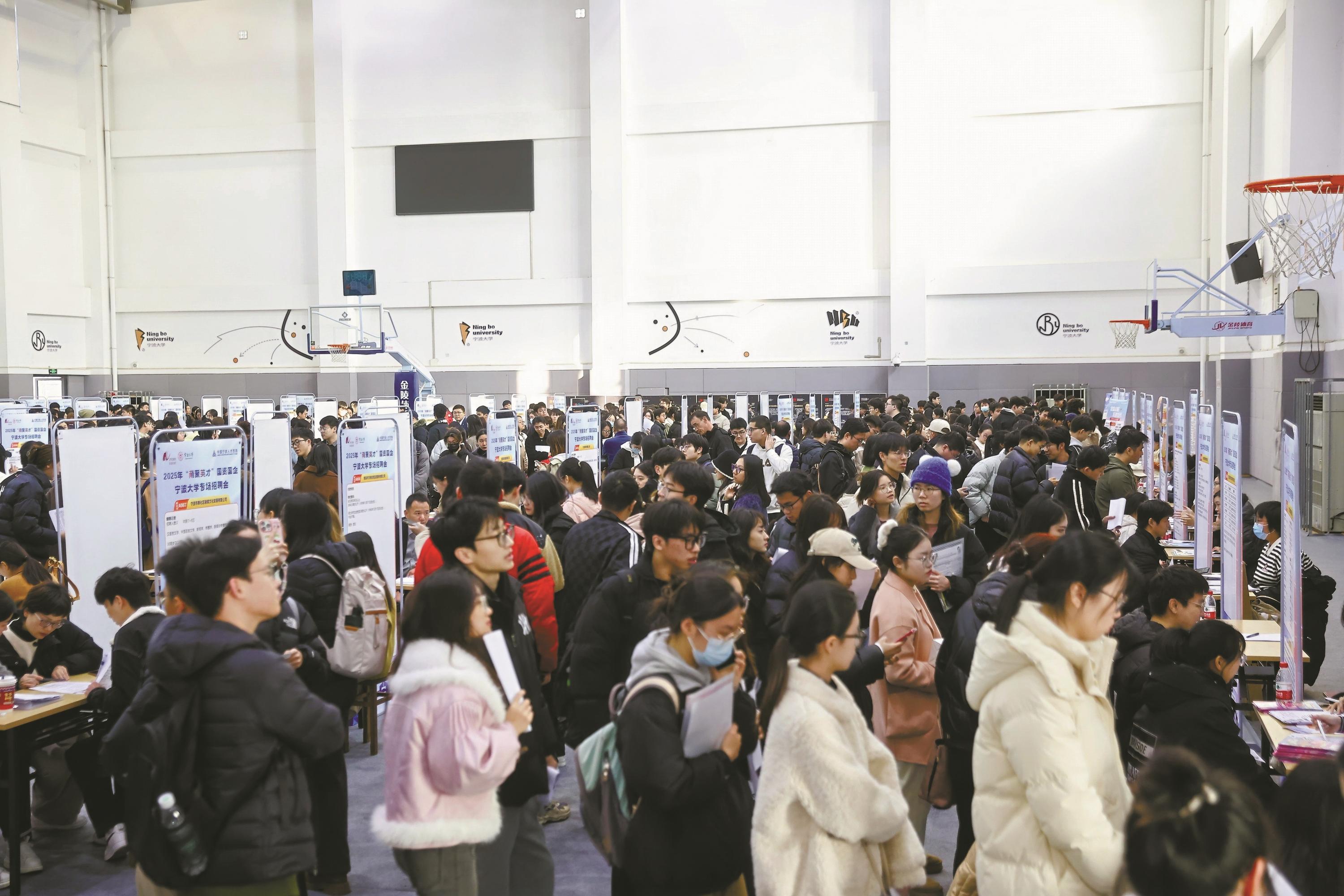 当天下午,宁波大学周亦卿体育馆一派热火朝天景象。记者在现场看到,偌大的体育馆里,招聘企业的摊位满满当当,求职学生摩肩接踵,很多招聘摊位前排起了长队。