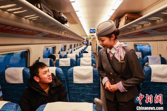 图为旅客与乘务员交谈。