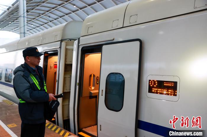 图为动车组乘务员身着全新的格桑花制服,在站台上迎接旅客。