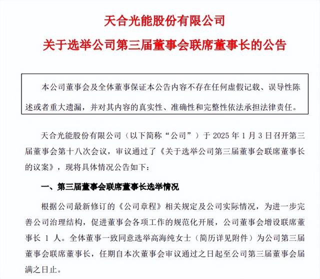 天合光能发布公告称,为进一步完善公司治理结构,促进董事会各项工作的规范化开展,公司全体董事一致同意选举董事长女儿高海纯为公司第三届董事会联席董事长,同时兼任公司解决方案事业群总裁,领导公司由光伏产品制造商向光储智慧能源解决方案服务商转型。