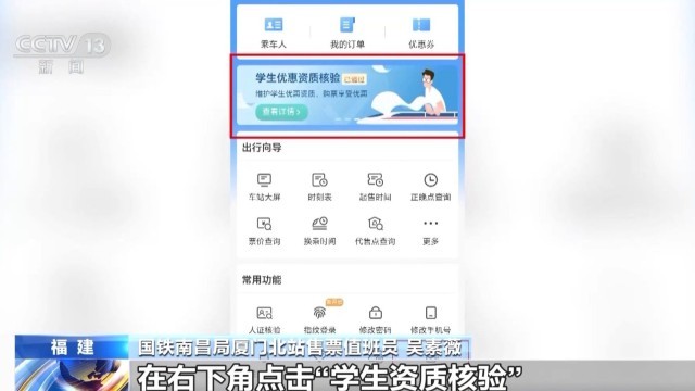国铁南昌局厦门北站售票值班员吴素薇:学生旅客下载并注册铁路12306App后,在铁路12306App首页,点击“我的”,在右下角点击“学生资质核验”,完成学生优惠资质核验后,即可根据实际情况线上变更学生票乘车区间。